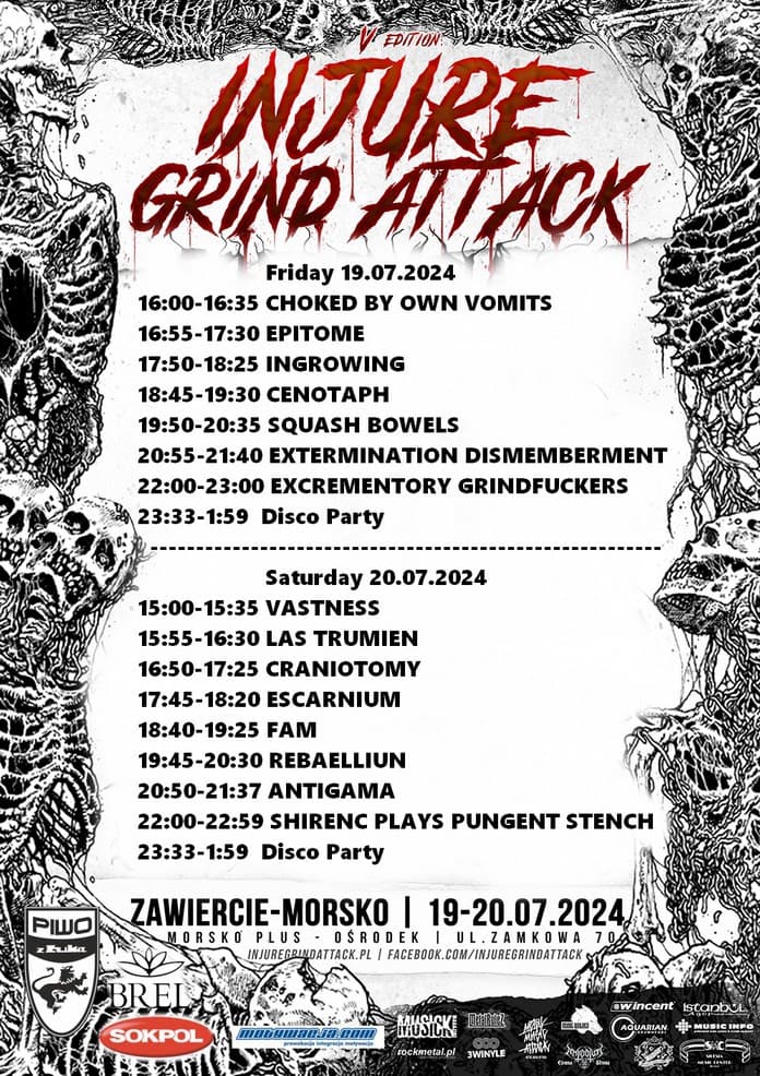 Injure Grind Attack 2024 po raz kolejny zmienia headlinera. Wcześniej z udziału w festiwalu wycofał się brazylijski zespół Krisiun, który został zastąpiony przez Schirenc Plays Pungent Stench. Fleshcrawl miał zagrać w pierwszy dzień festiwalu, ale z powodów zdrowotnych musi odwołać wszystkie najbliższe występy.