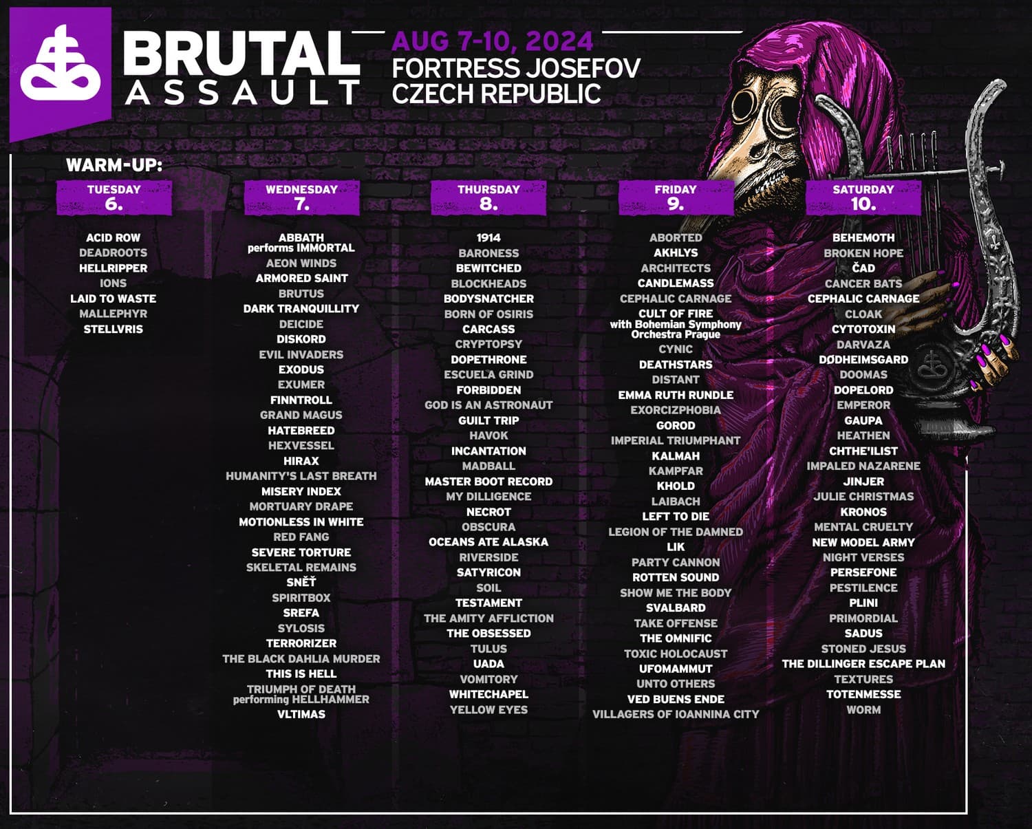 Tegoroczna odsłona Brutal Assault rozpocznie się w czeskiej Twierdzy Josefov już we wtorek, 6 sierpnia i potrwa do soboty, 10 sierpnia. Na scenie imprezy wystąpią tym razem m.in. takie kultowe formacje jak Behemoth, Hatebreed, Testament, Motionless In White, Spiritbox, Deicide, Dark Tranquillity, The Dillinger Escape Plan, czy Jinjer. Poznaliśmy już także dokładną rozpiskę, którego dnia jaki artysta zaprezentuje się na festiwalu.