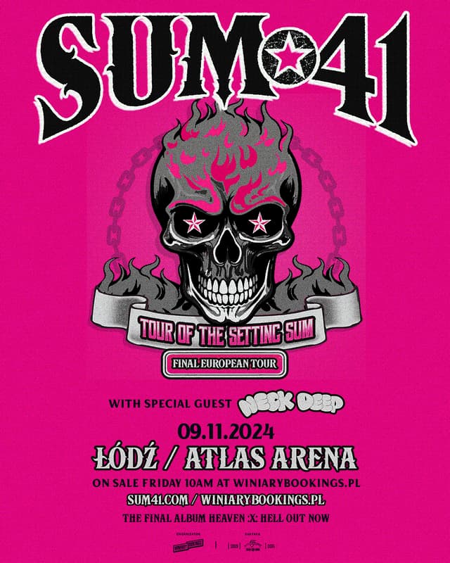 Na początku bieżącego roku punk rockowa formacja SUM 41 ogłosiła, że cały 2024 oraz początek 2025 roku spędzi na swojej pożegnalnej trasie koncertowej. Zespół postanowił odłożyć instrumenty do szafy po trzydziestu latach grania na międzynarodowych scenach. Polskich fanów grupy ucieszy na pewno fakt, że ekipa Derycka Whibleya w ramach swojego ostatniego tournée zawita także i do naszego kraju!