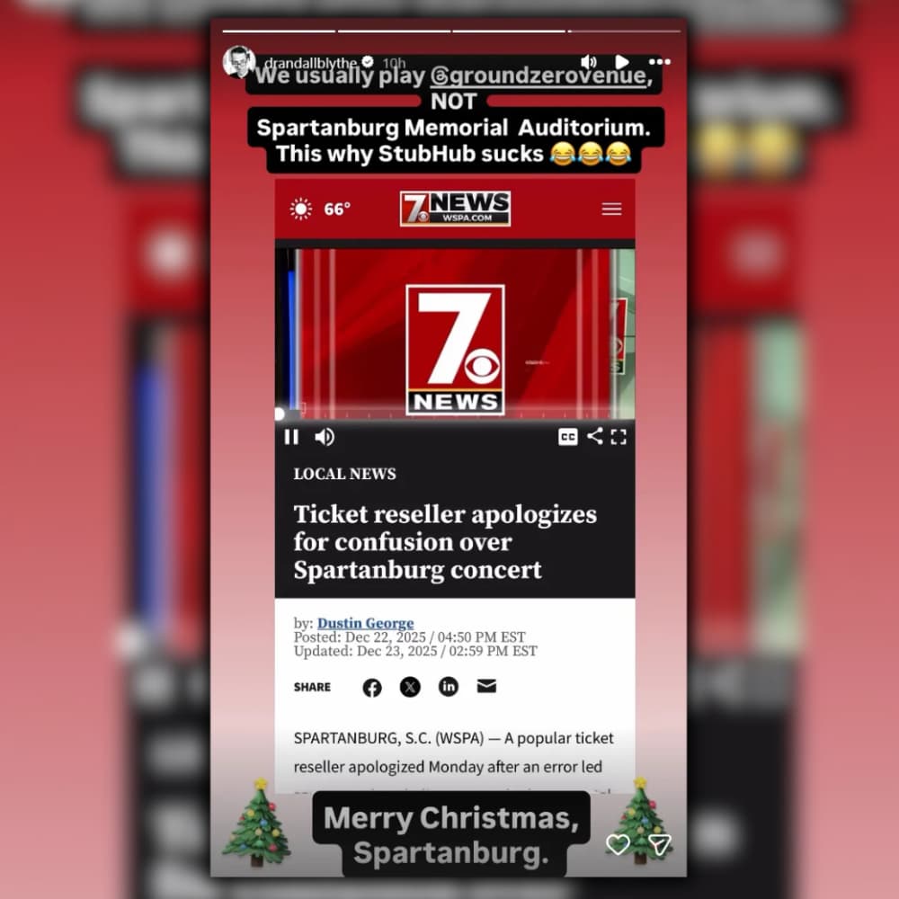 „Zazwyczaj gramy w Ground Zero Venue, a nie w Spartanburg Memorial Auditorium. Dlatego StubHub jest do niczego. Wesołych Świąt, Spartanburg”.